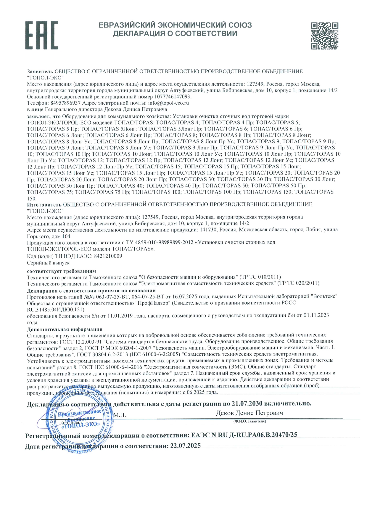• Декларация о соответствии Топас